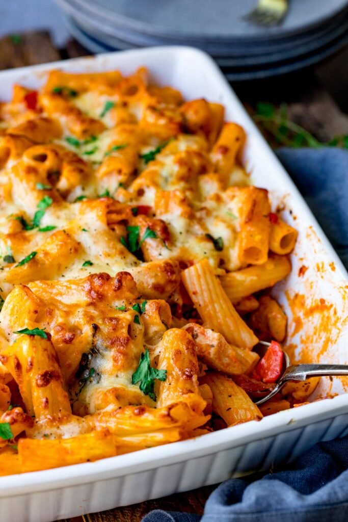 This pasta bake is perfect for meal prep. Assemble everything ahead of time, cover tightly, and refrigerate up to 24 hours before baking. You can also freeze it before baking—just thaw overnight in the fridge and bake as directed.