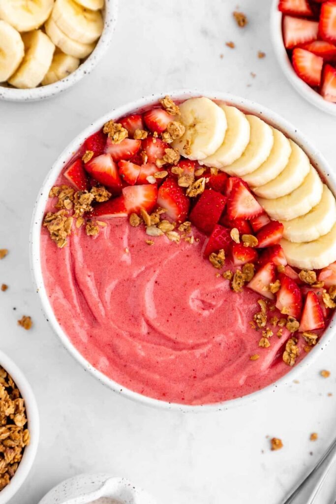 Let’s talk about what makes this smoothie bowl not just delicious but also nourishing. Strawberries are rich in vitamin C and antioxidants, which help boost your immune system and skin health. Bananas bring in natural sweetness, potassium, and fiber to keep you full. The Greek yogurt (or your favorite dairy-free alternative) adds protein and creaminess. Together, they create a balanced meal that’s refreshing, light, and full of energy. You’re basically fueling your body and mind with every spoonful!