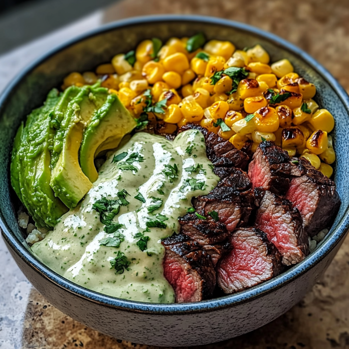 Steak Avocado & Roasted Corn Bowl with Cilantro Cream Sauce – Hearty & Flavor-Packed Meal